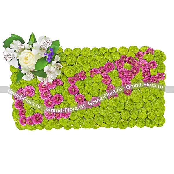 Стандартный: хризантема кустовая зеленая (сантини) - 20 шт, хризантема кустовая фиолетовая - 8 шт, гипсофила - 5 шт, роза белая - 1 шт, альстромерия белая - 2 шт, статица - 2 шт, оазис.