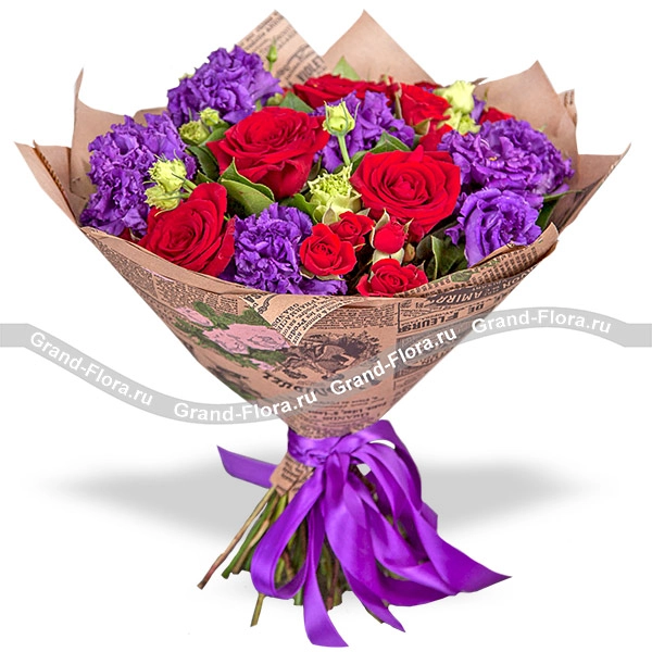 Люкс: роза красная - 7 шт., роза кустовая красная - 4 шт., эустома фиолетовая - 6 шт., декоративная зелень., упаковка, лента.