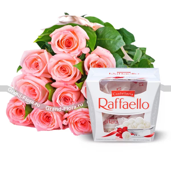 11 розовых роз + конфеты "Raffaello"